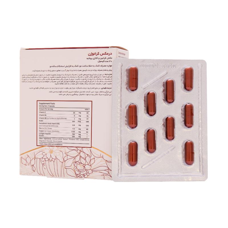مکمل کراتوژن شرکت درمکس که حاوی 30 عدد کپسول می باشد، محصولی تخصصی در حوزه بهبود